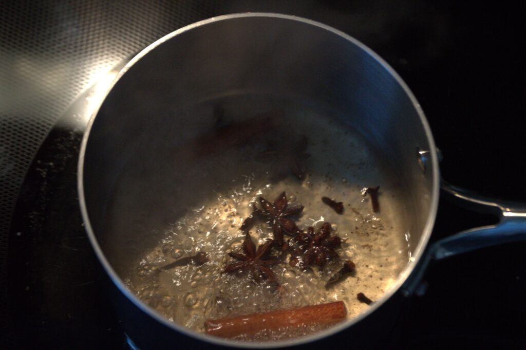- Make the Spice Tea: Add all of the spices for the tea into a small pot with ½ cup of water. Place this over medium high heat until it comes to a boil. Let it boil for 1 to 2 minutes then take it off the heat to let steep for at least 5 minutes.